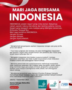 JAKARTA –Insan Tani dan Nelayan Indonesia (Intani) bersama Arus Baru Indonesia (ARBI) dan Mitra Mikro mengeluarkan pernyataan bertajuk “Mari Jaga Bersama Indonesia” yang disebarluaskan, Senin, 1 September 2025.